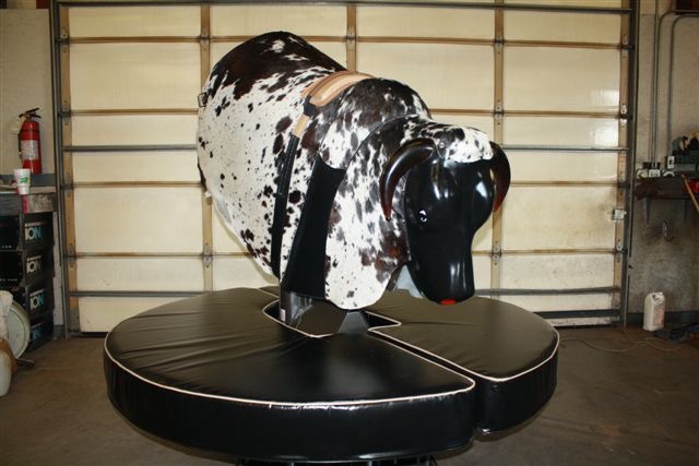 THE BULL is a newer version mechanical bull with a black and white hide and black head with horns. It can be used with or without the head and saddle and has a full sized pad as well.